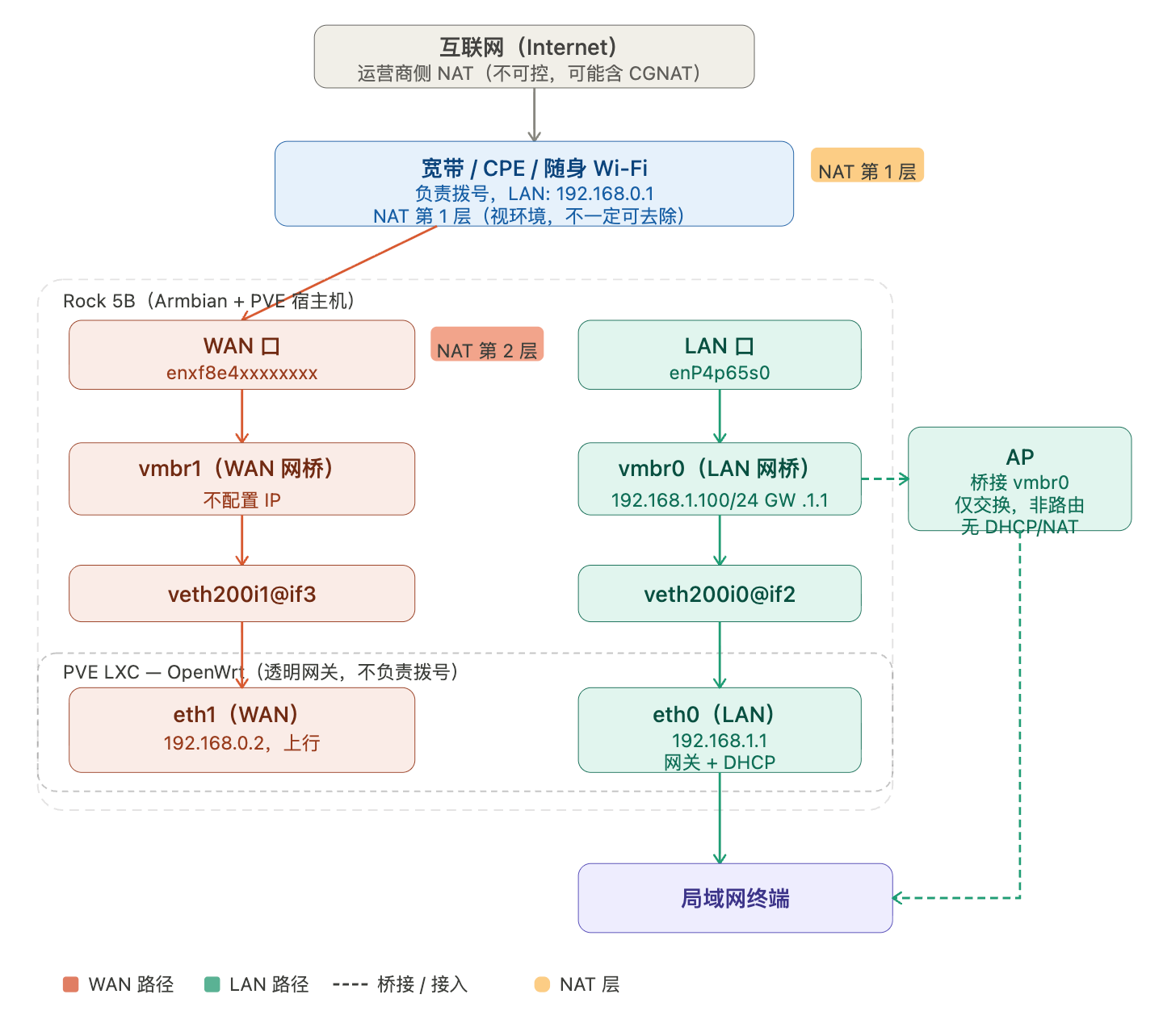 宿主机 (Rock5B + Armbian) └─ PVE (Hypervisor) ├─ LXC 容器 │ └─ OpenWrt └─KVM / QEMU 虚拟机 (暂略)
